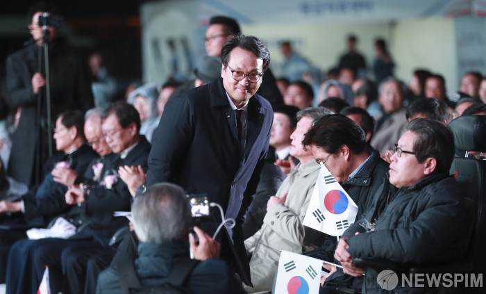 [서울=뉴스핌] 이형석 기자 = 안민석 국회 문화체육관광위원장이 10일 오후 서울 중구 서울광장에서 열린 의열단 100주년 기념식에서 인사를 하고 있다. 2019.11.10 leehs@newspim.com
