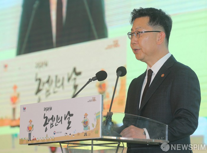 [세종=뉴스핌] 윤창빈 기자 = 김현수 농림축산식품부 장관이 11일 오전 세종시 정부세종컨벤션센터에서 열린 제24회 농업인의 날 기념식에서 축사를 하고 있다. 2019.11.11 pangbin@newspim.com
