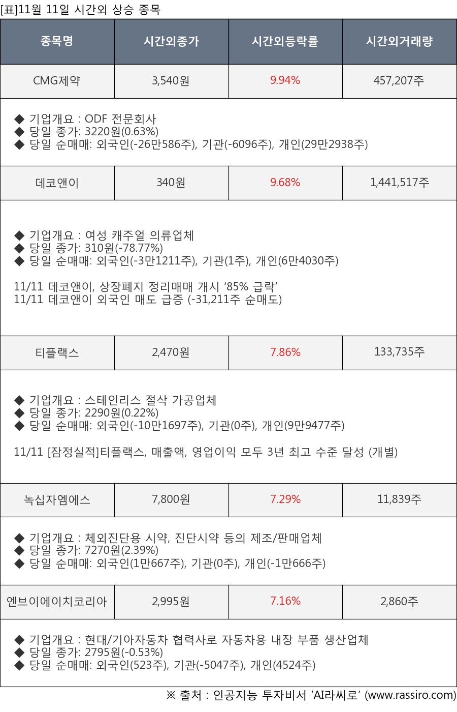 ※ 관련 종목: CMG제약, 데코앤이, 티플랙스, 녹십자엠에스, 엔브이에이치코리아