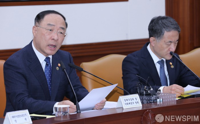 [서울=뉴스핌] 백인혁 기자 = 홍남기 부총리 겸 기획재정부 장관(왼쪽)이 13일 오전 서울 종로구 정부서울청사에서 열린 제26차 경제활력대책회의에서 모두발언을 하고 있다. 2019.11.13 dlsgur9757@newspim.com