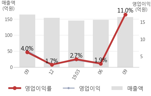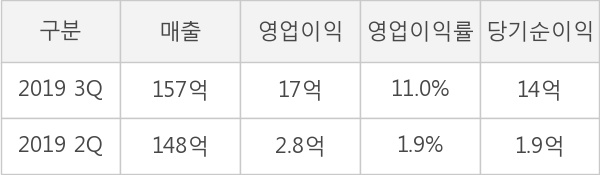 영업이익률을 자세히 살펴보면, 매출은 157억으로 전분기 대비해서 5.8% 증가하였고, 영업이익도 17억으로 514.3% 증가하면서 전체적으로 실적이 좋아진 것을 알 수 있는데 매출 증가폭에 비해 영업이익 증가폭이 더 커서 영업이익률도 상승한 것을 알 수 있다.