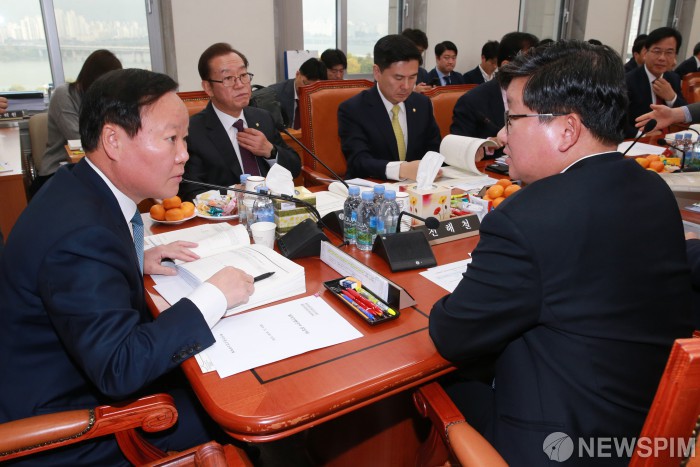 [서울=뉴스핌] 이형석 기자 = 김재원 소위원장과 전해철 더불어민주당 간사가 15일 오전 서울 여의도 국회에서 열린 예산결산특별위원회 예산안조정소위원회의에서 대화를 나누고 있다. 2019.11.15