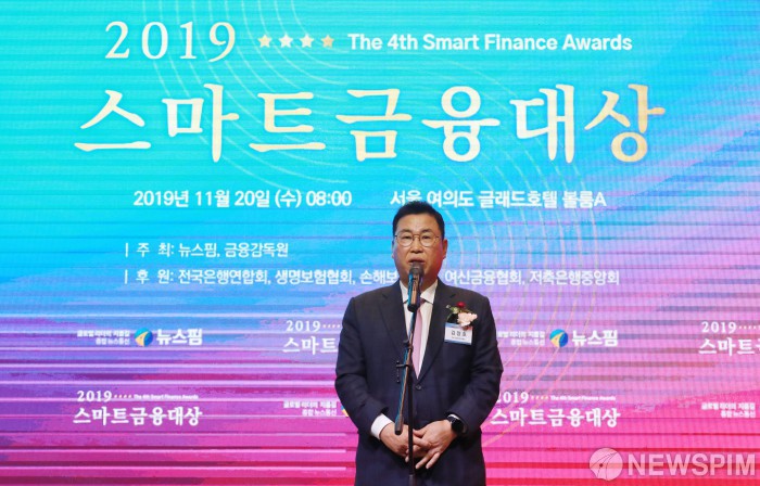 [서울=뉴스핌] 이형석 기자 = 김창호 IBK기업은행 소비자브랜드그룹 부행장이 20일 오전 서울 여의도 글래드호텔에서 열린 2019 스마트금융대상에서 금융감독원장상을 수상하고 소감을 밝히고 있다. 2019.11.20 leehs@newspim.com