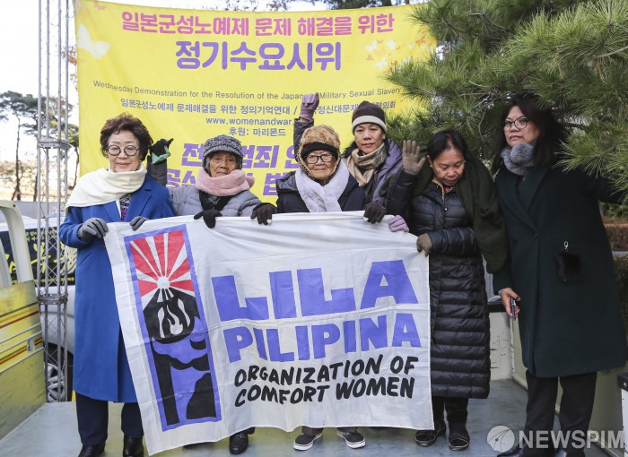 [서울=뉴스핌] 이한결 기자 = 20일 오후 서울 종로구 옛 일본대사관 앞 평화로에서 열린 '일본군 성노예제 문제해결을 위한 제1414차 정기 수요시위'에서 필리핀에서 온 참석자들이 기념촬영을 하고 있다. 왼쪽부터 일본군 위안부 피해자 이용수, 나르시사 클라베리아, 에스텔리타 디 할머니. 2019.11.20 alwaysame@newspim.com