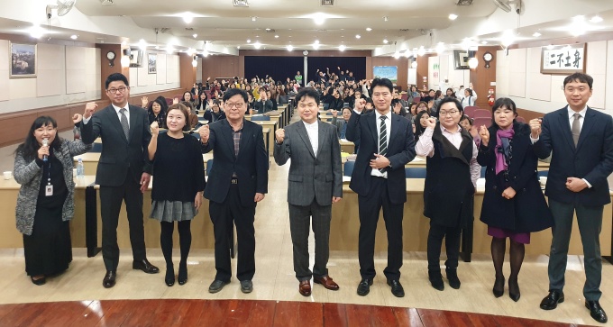 | '2020 학교급식 수산물 공동구매 업체' 선정을 위한 평가단 투표 후 관계자들이 기념촬영을 하고 있다. [사진=수원시] 4611c@newspim.com |
