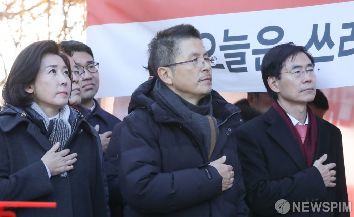 [서울=뉴스핌] 최상수 기자 = 황교안 자유한국당 대표(가운데), 나경원 원내대표(왼쪽), 조경태 최고위원(오른쪽)을 비롯한 의원들이 2일 오전 서울 종로구 청와대 앞에서 열린 최고위원회의에서 국민의례를 하고 있다. 2019.12.02 kilroy023@newspim.com