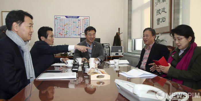 [서울=뉴스핌] 이한결 기자 = 김관영 바른미래당 의원(왼쪽부터), 윤소하 정의당 원내대표, 윤호중 더불어민주당 사무총장, 유성엽 대안신당 창당준비위원장, 박주현 민주평화당 의원이 8일 오후 서울 여의도 국회에서 열린 4+1 선거법 협의체 회의에 참석해 있다. 2019.12.08 alwaysame@newspim.com