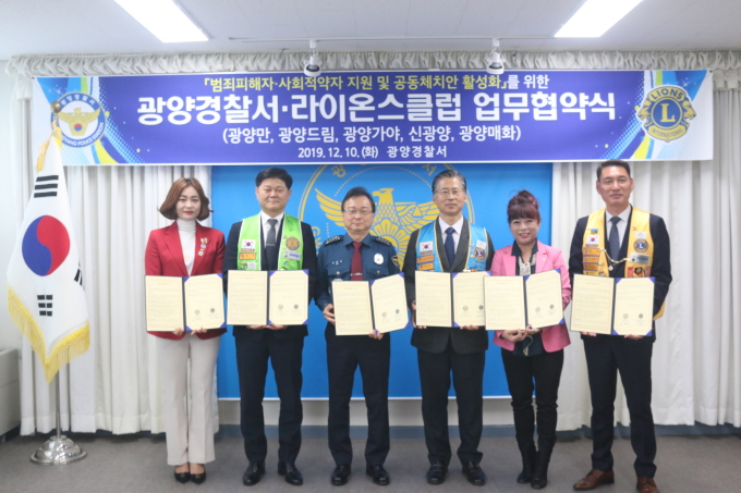 [광양=뉴스핌] 박우훈 기자 = 광양경찰서는 광양경찰서 2층 소회의실에서 라이온스클럽(광양만, 광양드림, 광양가야, 신광양, 광양매화)과 업무협약을 10일 체결했다.
