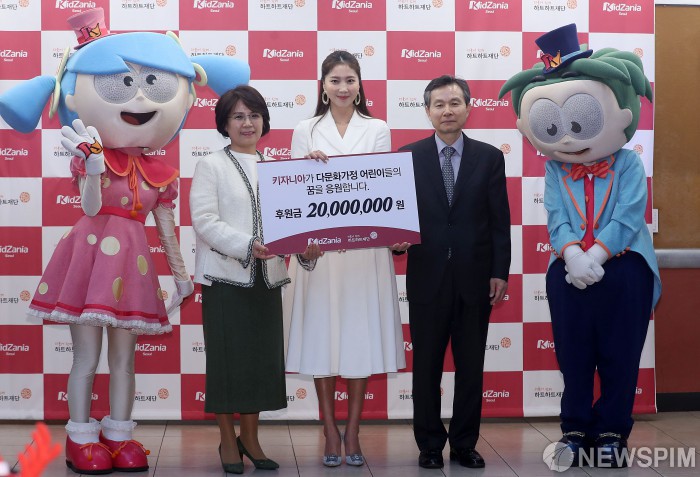 [서울=뉴스핌] 정일구 기자 = 12일 오후 서울 송파구 키자니아 서울에서 열린 '2019 하트-하트재단 하트베어 나눔트리 기부금 전달식'에서 최성금 키자니아 대표(왼쪽부터), 홍보대사인 배우 오윤아, 오지철 하트-하트재단 이사장이 기념촬영을 하고 있다. 2019.12.12 mironj19@newspim.com