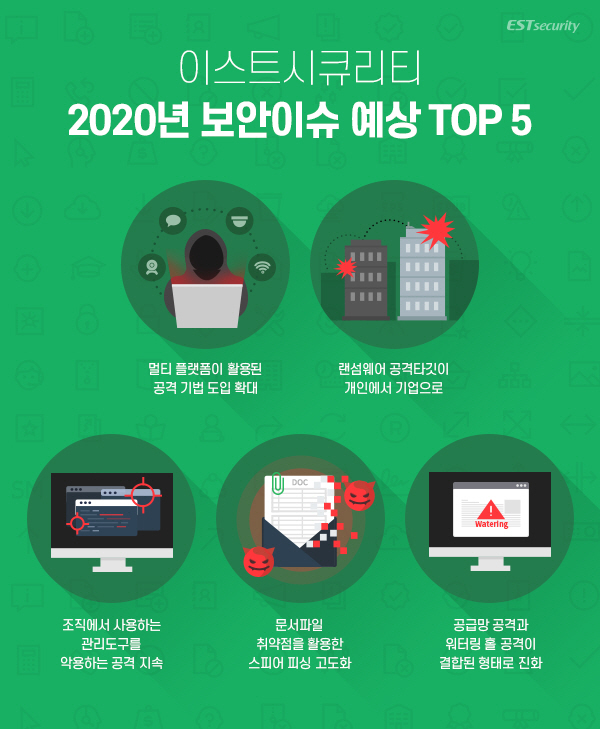 먼저 이스트시큐리티는 갈수록 고도화된 수법을 활용하는 사이버 보안 위협 대비를 위해 ▲멀티 플랫폼이 활용된 공격 기법 확대 ▲개인에서 기업으로 랜섬웨어 공격타깃 변화 ▲조직에서 사용하는 관리 도구를 악용하는 공격 지속 ▲문서 파일 취약점을 활용한 스피어 피싱 고도화 ▲공급망 공격과 워터링 홀(Watering Hole) 공격 형태의 결합을 '2020년 예상 보안이슈 TOP 5'로 꼽았다.