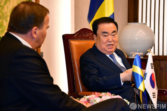 [서울=뉴스핌] 국회사진취재단 = 문희상 국회의장이 19일 오후 국회 의장 접견실에서 한국을 공식 방문한 스테판 뢰벤 스웨덴 총리를 만나고 있다. 2019.12.19 photo@newspim.com