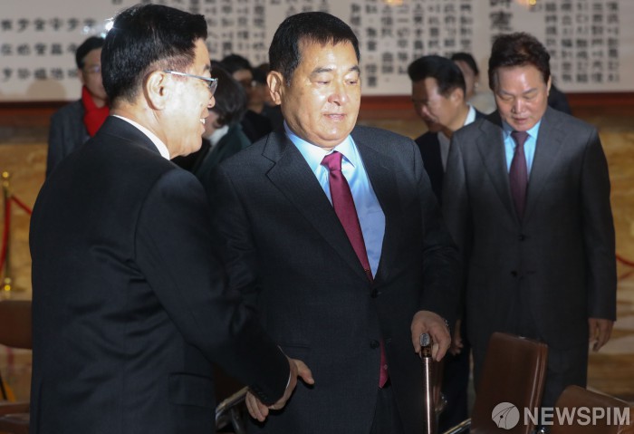 [서울=뉴스핌] 최상수 기자 = 심재철 자유한국당 원내대표(앞줄 오른쪽), 김광림 의원(앞줄 왼쪽)이 26일 오전 서울 여의도 국회에서 열린 최고위원회의에서 악수를 나누고 있다. 2019.12.26 kilroy023@newspim.com