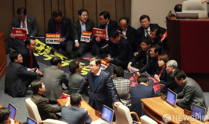 [서울=뉴스핌] 이형석 기자 = 자유한국당 의원들이 27일 오후 서울 여의도 국회에서 본회의 개회를 막기 위해 의장석을 점거하고 있다. 2019.12.27 leehs@newspim.com