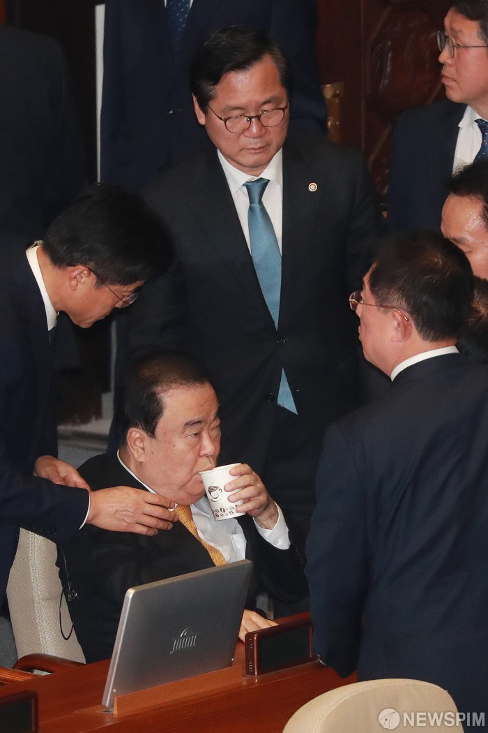 [서울=뉴스핌] 이형석 기자 = 27일 오후 서울 여의도 국회에서 의장석에 오르지 못한 문희상 국회의장이 물을 마시고 있다. 이날 자유한국당 의원들이 선거법 개정안 표결을 막기 위해 국회 의장석 통로를 점거했다. 2019.12.27 leehs@newspim.com