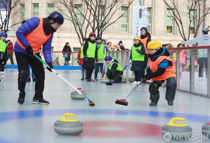 [서울=뉴스핌] 이형석 기자 = 2019년 마지막 주말을 맞이한 28일 오전 서울 중구 서울광장 스케이트장에서 어린아이들이 컬링을 즐기고 있다. 2019.12.28 leehs@newspim.com