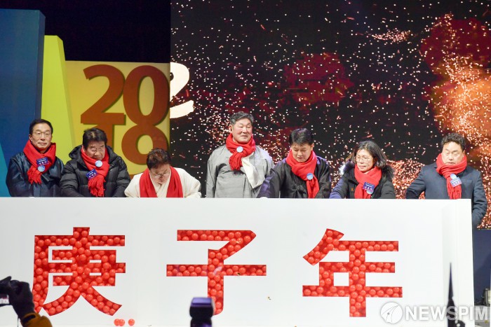 [영덕=뉴스핌] 남효선 기자 = 기해년 마지막날인 31일과 경자년 새해 첫날인 1일 경북 영덕군 삼사해상공원 일원서 열린 '2020 영덕 해맞이 경북대종 타종식'에서 이철우 경북지사와 강석호 국회의원을 비롯 장경식 도의장, 이희진 영덕군수, 김은희 영덕군의장 등 각급 기관단체장들이 타종식 퍼포먼스를 갖고 있다.이날 열린 타종식은 오프닝 퍼포먼스, 입장 퍼레이드, 경북대종 계단 제막, 제야의 경북대종 타종식, 새해희망 퍼포먼스, 새해소망 소지 달집태우기 순으로 진행됐으며, 이철우 경북지사, 강석호 국회의원, 장경식 경북도의회의장을 비롯 이희진 영덕군수, 김은희 영덕군의장 등 각급 기관단체장과 주민, 관광객 8000여명이 참가했다. 새해 첫날 삼사해상공원을 비롯 영덕지역 해돋이 명소에는 13만여명의 인파가 경자년 첫 해돋이를 감상한 것으로 집계됐다.[사진=영덕군] 2020.01.01 nulcheon@newspim.com