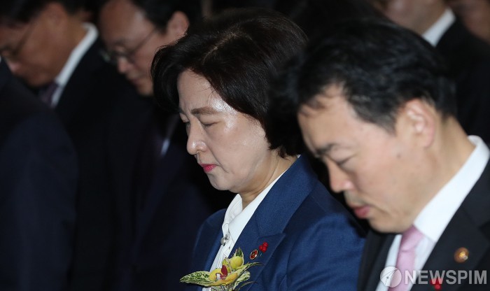 [과천=뉴스핌] 정일구 기자 = 추미애 신임 법무부 장관이 3일 오전 경기 과천시 정부과천청사에서 열린 취임식에서 순국선열에 대한 묵념를 하고 있다. 2020.01.03 mironj19@newspim.com