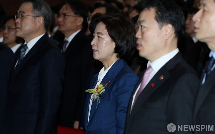 [과천=뉴스핌] 정일구 기자 = 추미애 신임 법무부 장관이 3일 오전 경기 과천시 정부과천청사에서 열린 취임식에서 애국가를 부르고 있다. 2020.01.03 mironj19@newspim.com