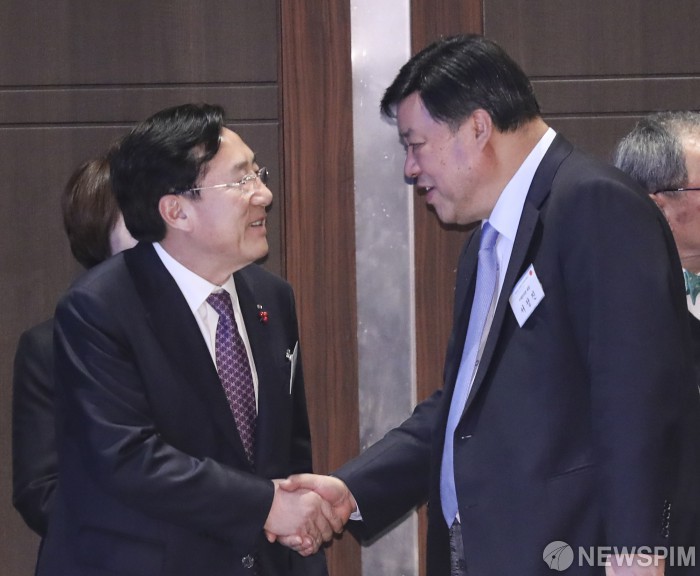 [서울=뉴스핌] 이한결 기자 = 김기문 중소기업중앙회(중기중앙회) 회장과 서정진 셀트리온 회장이 3일 오후 서울 강남구 코엑스에서 열린 ‘2020년 경제계 신년인사회’에서 대화를 하고 있다. 2020.01.03 alwaysame@newspim.com
