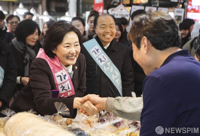 [서울=뉴스핌] 이한결 기자 = 박영선 중소벤처기업부 장관이 16일 오전 서울 강동구 암사종합시장에 설 명절 맞이 전통시장 이용 캠페인 일환으로 방문해 시장상인들과 인사를 나누고 있다. 2020.01.16 alwaysame@newspim.com