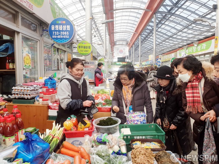 [영덕=뉴스핌] 남효선 기자 = 재경대구‧경북시도민회(회장 강보영)가 20일 태풍 '미탁' 피해지인 경북 영덕군 영해면 전통시장인 영해만세시장을 찾아 '설맞이 전통시장 장보기' 행사를 펼치고 있다. 이날 도민회원 120여명은 영해만세시장을 순회하며 특산물과 제수용품 구입과 함께 지역민들과 새해맞이 덕담을 나누고 전통시장의 어려움을 공유했다. 또 이들은 '태백산 호랑이'로 불리는 의병장 '신돌석장군 유적지'를 방문해 항일정신을 되새겼다.[사진=경북도] 2020.01.20 nulcheon@newspim.com