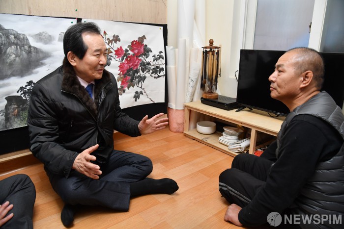 [서울=뉴스핌] 백인혁 기자 = 정세균 국무총리가 설을 앞두고 22일 오후 서울 용산구 쪽방촌에 방문해 거주민과 대화를 나누고 있다. [사진=국무총리실] 2020.01.22 dlsgur9757@newspim.com
