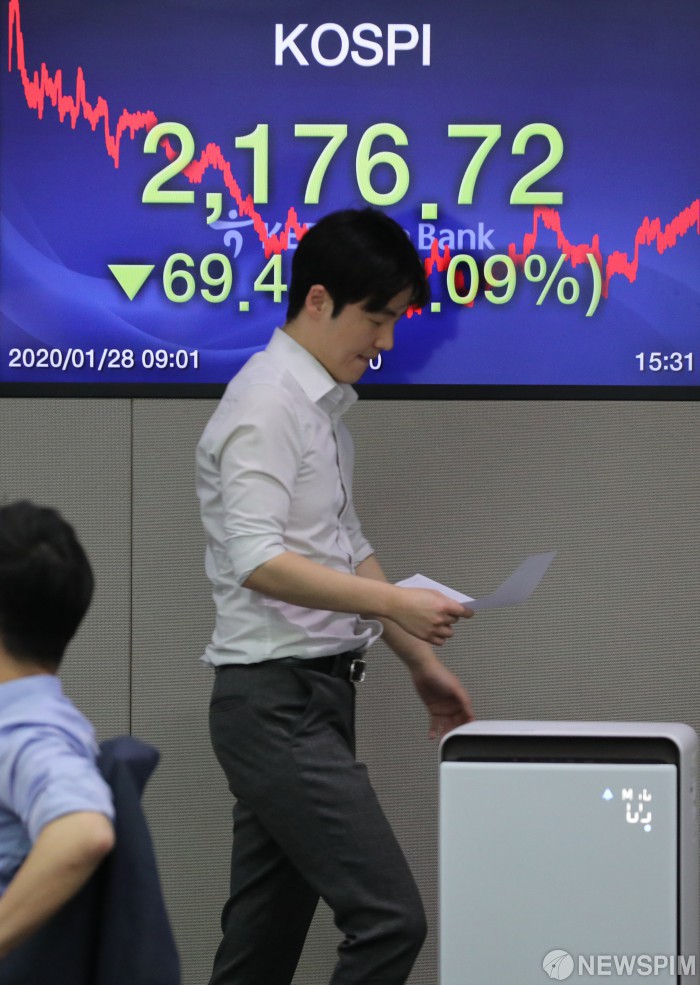 [서울=뉴스핌] 백인혁 기자 = 28일 오후 서울 중구 KEB하나은행 딜링룸에서 딜러들이 업무를 보고 있다. 이날 코스피 지수가 신종코로나바이러스 감염증인 '우한 폐렴' 공포로 인해 3% 넘게 급락하면서 2,180선이 무너져 전 거래일보다 69.41포인트(3.09)% 내린 2,176.72로 마감했다. 2019.01.28 dlsgur9757@newspim.com