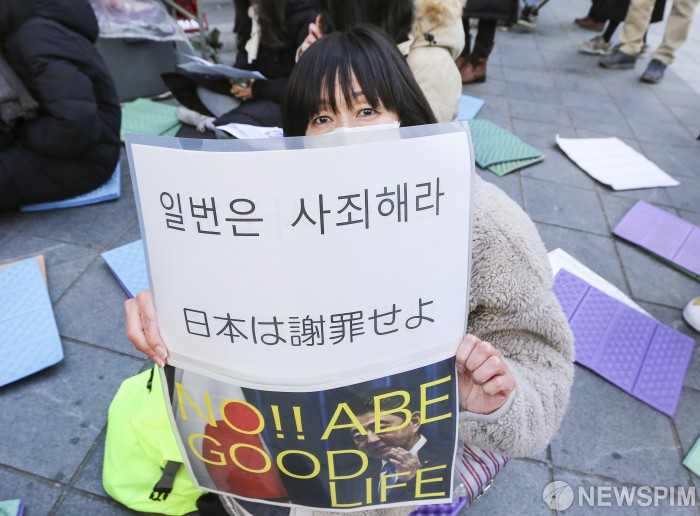 [서울=뉴스핌] 이한결 기자 = 5일 오후 서울 종로구 옛 주한 일본대사관 앞 평화로에서 열린 ‘제1425차 일본군성노예제 문제해결을 위한 정기 수요시위’에서 일본인 참가자가 손 팻말을 들고 있다. 2020.02.05 alwaysame@newspim.com