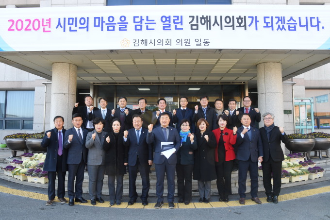 이어 '2020년 시민의 마음을 담는 열린 김해시의회가 되겠습니다'란 플래카드를 게첨했다.