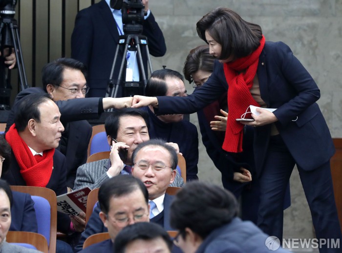 [서울=뉴스핌] 이형석 기자 = 나경원 자유한국당 의원이 6일 오전 서울 여의도 국회에서 열린 의원총회에 참석하며 정진석 의원과 인사를 나누고 있다. 2020.02.06 leehs@newspim.com