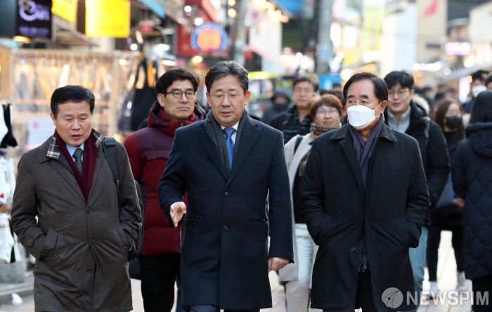 [서울=뉴스핌] 이현경 기자 = 박양우 문체부 장관이 6일 오후 서울 마포구 홍대앞 걷고싶은거리에서 판매하는 마스크를 살펴보고 있다. [사진=문체부] 2020.02.07 89hklee@newspim.com