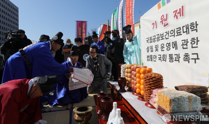 [서울=뉴스핌] 최상수 기자 = 국립공공의료대학 설립을 위한 범 대책위, 남원향교가 18일 오전 서울 여의도 국회 앞에서 국립공공보건의료대학 설립 및 운영에 대한 법률안 국회 통과 촉구 기원제를 지내고 있다. 2020.02.18 kilroy023@newspim.com
