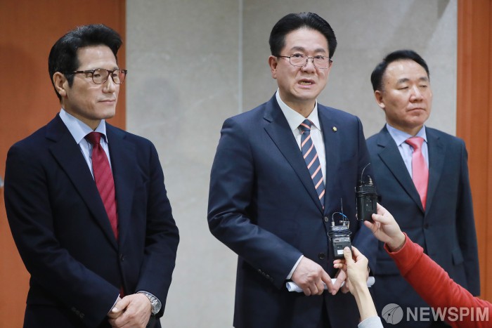[서울=뉴스핌] 이형석 기자 = 이동섭 무소속 의원이 21일 오후 서울 여의도 국회 정론관에서 미래통합당 입당 기자회견을 마치고 취재진의 질문에 답하고 있다. 2020.02.21 leehs@newspim.com