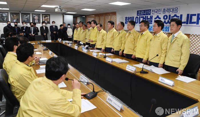 [서울=뉴스핌] 최상수 기자 = 김상조 청와대 정책실장과 이낙연 코로나19 재난안전대책위원회 위원장, 이해찬 대표, 이인영 원내대표, 홍남기 경제부총리, 박능후 보건복지부 장관이 25일 오전 서울 여의도 더불어민주당 중앙당사에서 열린 고위당정협의회에 참석하고 있다. 2020.02.25 kilroy023@newspim.com