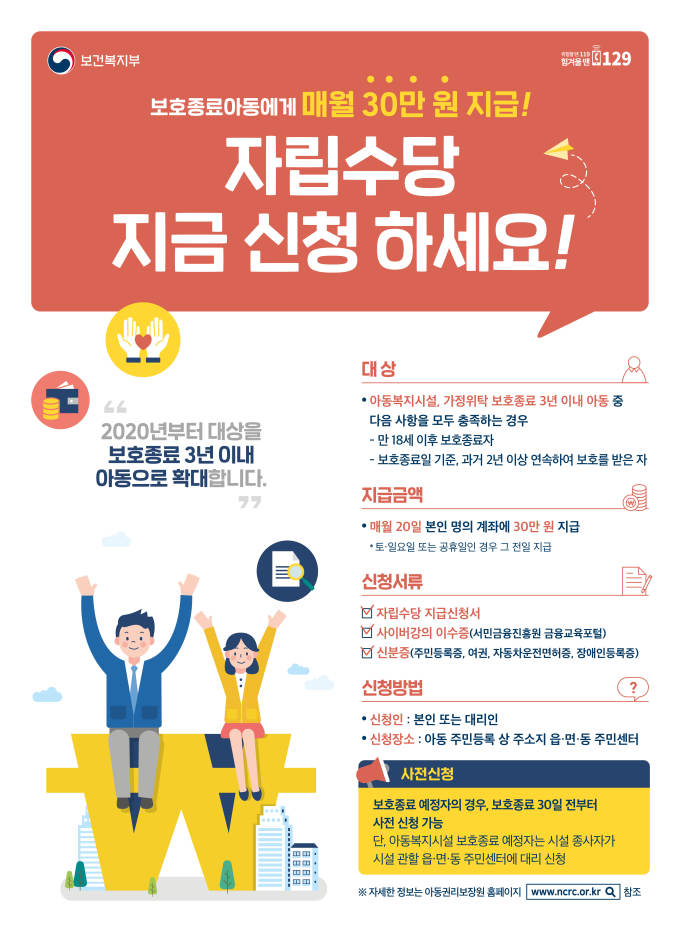 올해부터는 이들이 좀 더 사회에 안정적으로 정착할 수 있도록 지급대상자를 기존 보호종료 2년에서 3년 이내 아동으로 확대했다.