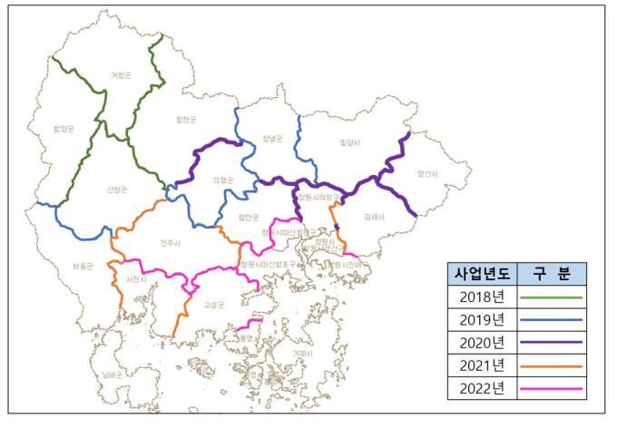 올해는 창원의창, 김해, 밀양, 양산, 의령, 함안, 창녕, 합천 등 8개 시군의 9개 구간 1393필지에 대해 정비를 추진할 계획이며, 나머지 지역도 2022년까지 연차적으로 정비를 완료할 예정이다.