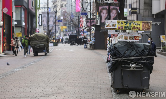 [서울=뉴스핌] 이한결 기자 = 코로나19(코로나바이러스감염증-19)의 확산이 계속되고 있는 1일 오후 서울 중구 명동거리가 주말임에도 불구하고 휑하게 비어있다. 한 상인은 노점 영업을 준비하며 손님이 많이 줄어 일부러 늦게 출근했다고 밝혔다. 2020.03.01 alwaysame@newspim.com