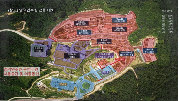 정문을 통해 출입이 통제되고, 출입하는 차량에 방역을 실시한다. 또 영덕연수원 내부에서 숙소동으로 갈 수 있는 모든 길목에 펜스를 설치해 영덕연수원 내부에서도 숙소동으로 이동할 수 없게 했다.