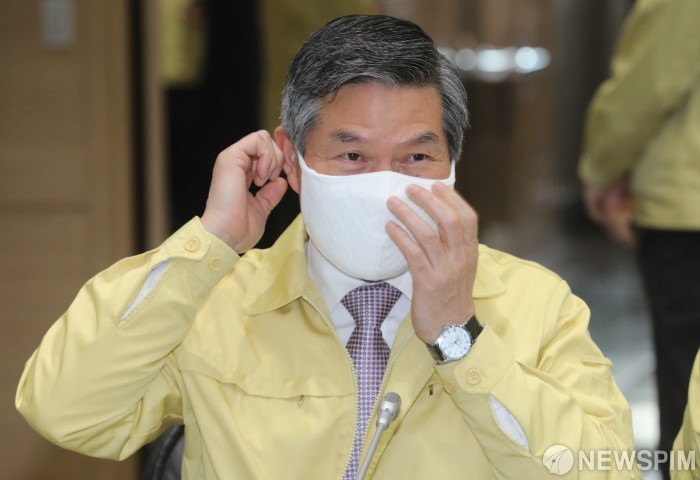 [서울=뉴스핌] 백인혁 기자 = 정경두 국방부 장관이 12일 오전 서울 종로구 정부서울청사에서 열린 신종 코로나바이러스 감염증(코로나19) 대응 중앙재난안전대책본부 회의에 참석해 마스크를 벗고 있다. 2020.03.12 dlsgur9757@newspim.com