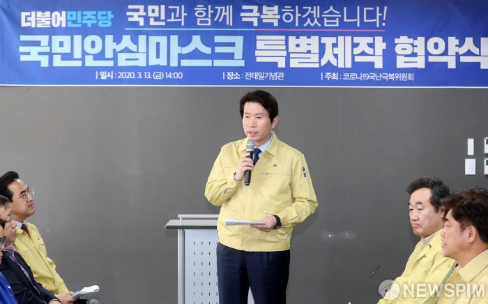 [서울=뉴스핌] 정일구 기자 = 13일 오후 서울 종로구 전태일기념관에서 열린 '국민안심마스크 특별제작 협약식'에서 이인영 더불어민주당 원내대표가 인사말을 하고 있다. 2020.03.13 mironj19@newspim.com