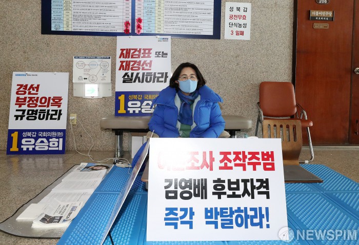 [서울=뉴스핌] 정일구 기자 = 유승희 더불어민주당 의원이 22일 오후 서울 여의도 국회 당대표실 앞에서 공천 무효를 주장하며 재경선, 재검표를 촉구하는 단식농성을 하고 있다. 2020.03.22 mironj19@newspim.com