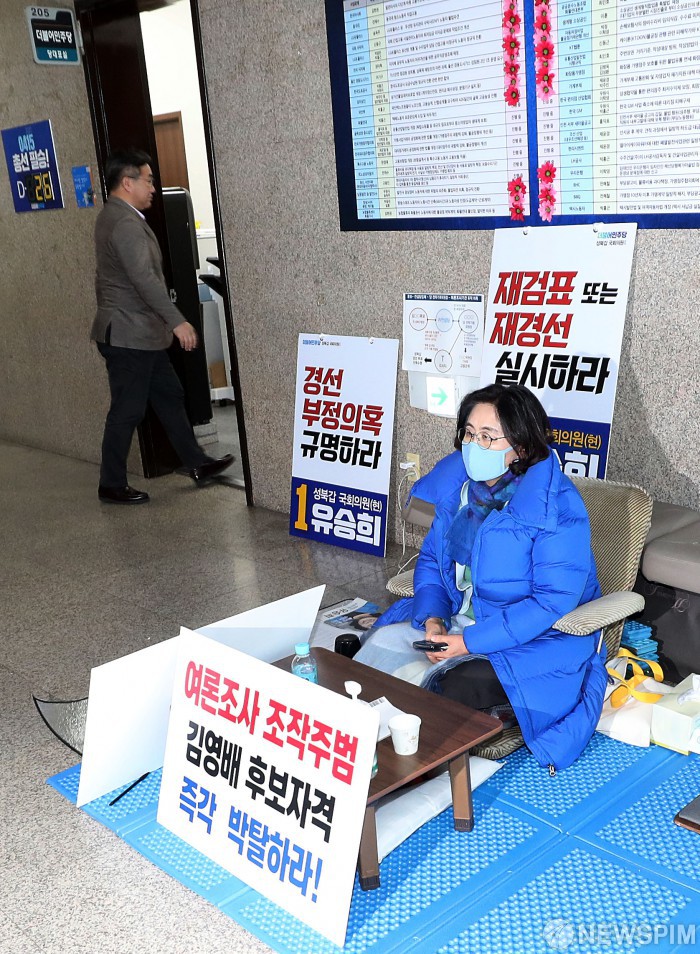 [서울=뉴스핌] 정일구 기자 = 유승희 더불어민주당 의원이 22일 오후 서울 여의도 국회 당대표실 앞에서 공천 무효를 주장하며 재경선, 재검표를 촉구하는 단식농성을 하고 있다. 왼쪽은 공천 결과 관련 기자간담회 참석하는 윤호중 사무총장. 2020.03.22 mironj19@newspim.com