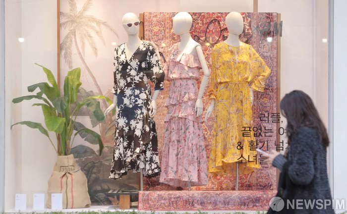 [서울=뉴스핌] 윤창빈 기자 = 24일 오전 서울 중구 명동의 한 옷가게에 전시된 봄옷 마네킨 앞으로 마스크를 쓴 시민들이 지나가고 있다. 봄 기운이 물씬 나는 서울의 한 낮 기온은 17도까지 오를 예정이다. 2020.03.24 pangbin@newspim.com