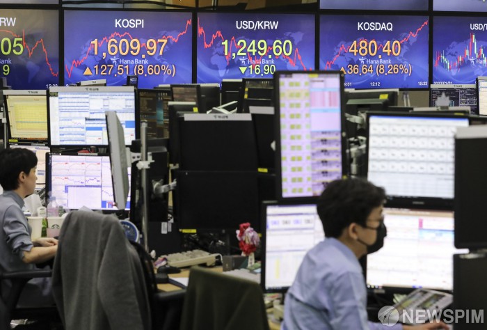 [서울=뉴스핌] 이한결 기자 = 전 세계적 코로나19 확산세가 지속되고 있는 24일 오후 코스피 지수가 전 거래일 대비 127.51포인트(8.60%) 오른 1,609.97에 마감했다. 코스닥 지수는 36.64포인트(8.26%) 오른 480.40에 종료했고 달러/원 환율은 16.9원 내린 1249.60원에 장을 마쳤다. 이날 서울 중구 하나은행 딜링룸에서 딜러들이 업무를 보고 있다. 2020.03.24 alwaysame@newspim.com