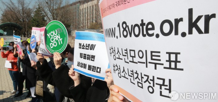 [서울=뉴스핌] 이형석 기자 = 4.15 제21대 국회의원선거 청소년모의투표중앙본부가 30일 오전 서울 여의도 국회 앞에서 발대식을 열고 있다. 이날 중앙본부는 4.15 제21대 국회의원선거를 맞이하여 만 17세 이하 투표권이 없는 청소년선거인단 20만명이 참여하는 전국 17개 시·도 국회의원 청소년모의투표운동을 전개할 것이라고 밝혔다. 2020.03.30 leehs@newspim.com