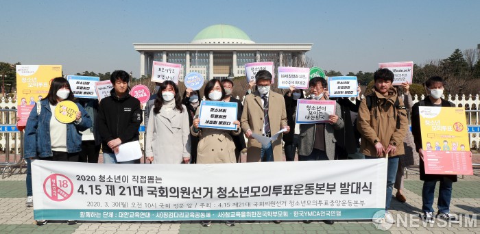 [서울=뉴스핌] 이형석 기자 = 4.15 제21대 국회의원선거 청소년모의투표중앙본부가 30일 오전 서울 여의도 국회 앞에서 발대식을 열고 있다. 이날 중앙본부는 4.15 제21대 국회의원선거를 맞이하여 만 17세 이하 투표권이 없는 청소년선거인단 20만명이 참여하는 전국 17개 시·도 국회의원 청소년모의투표운동을 전개할 것이라고 밝혔다. 2020.03.30 leehs@newspim.com