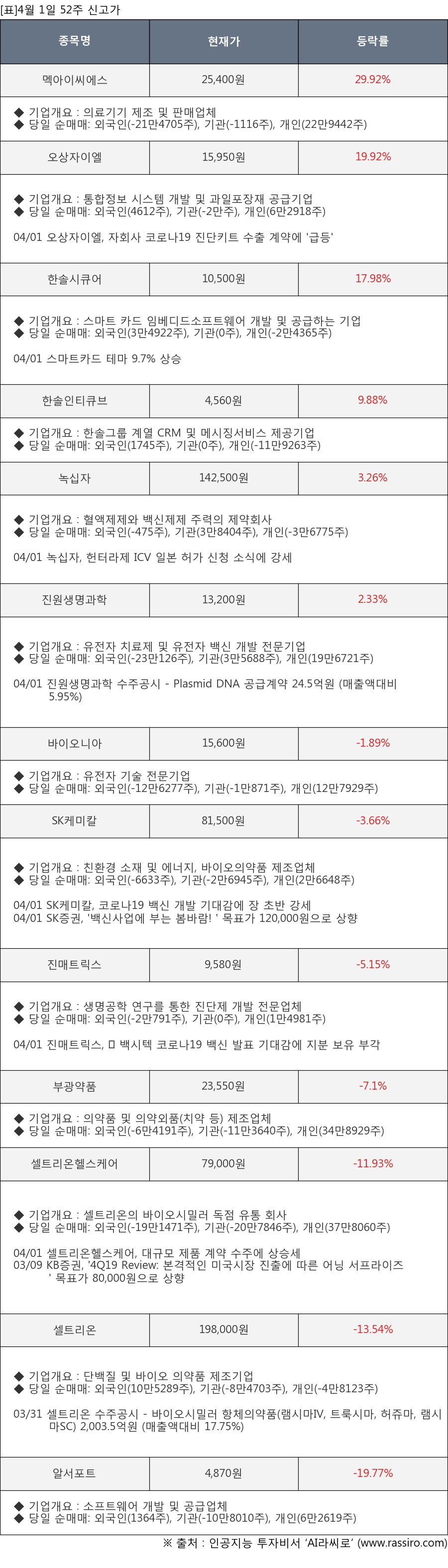 ※ 관련 종목: 멕아이씨에스, 오상자이엘, 한솔시큐어, 한솔인티큐브, 녹십자, 진원생명과학, 바이오니아, SK케미칼, 진매트릭스, 부광약품, 셀트리온헬스케어, 셀트리온, 알서포트