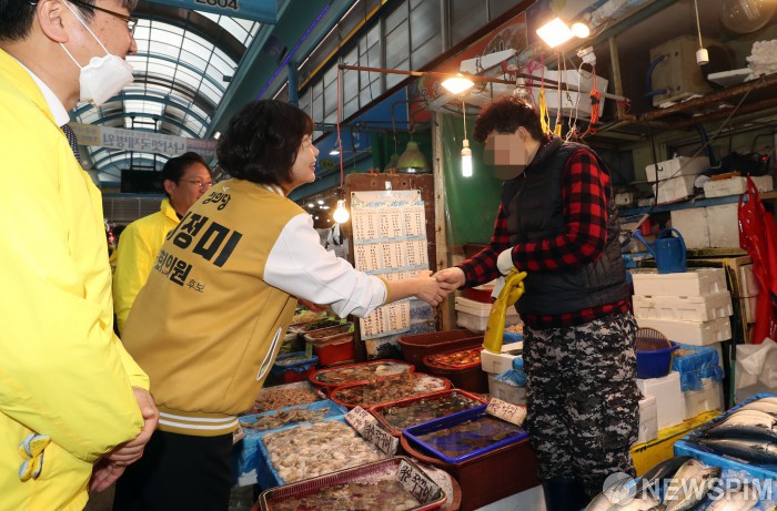 [인천=뉴스핌] 정일구 기자 = 이정미 정의당 인천 연수을 후보가 4·15 총선 공식 선거운동 시작일인 2일 오후 인천 연수구 옥련시장에서 상인들과 인사를 하고 있다. 2020.04.02 mironj19@newspim.com