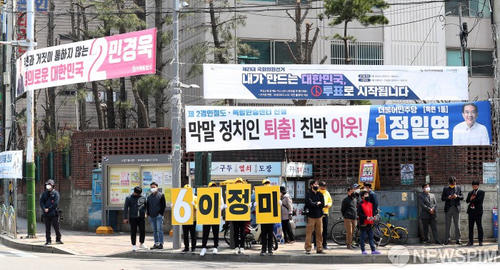 [인천=뉴스핌] 정일구 기자 = 4·15 총선 공식 선거운동 시작일인 2일 오후 인천 연수구 옥련시장 인근에 정일영 더불어민주당, 민경욱 미래통합당 연수을 후보의 선거 현수막이 걸려있는 가운데 이정미 후보 선거운동원들이 선거운동을 하고 있다. 2020.04.02 mironj19@newspim.com