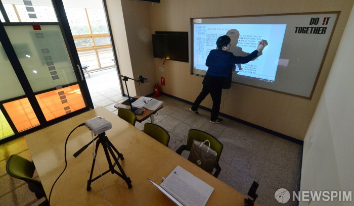 [인천=뉴스핌] 정일구 기자 = 2일 오후 신종 코로나바이러스 감염증(코로나19) 대응 원격교육 현장인 인천 서구 초은고등학교에서 교사가 수업 영상을 녹화하고 있다. 2020.04.02 mironj19@newspim.com